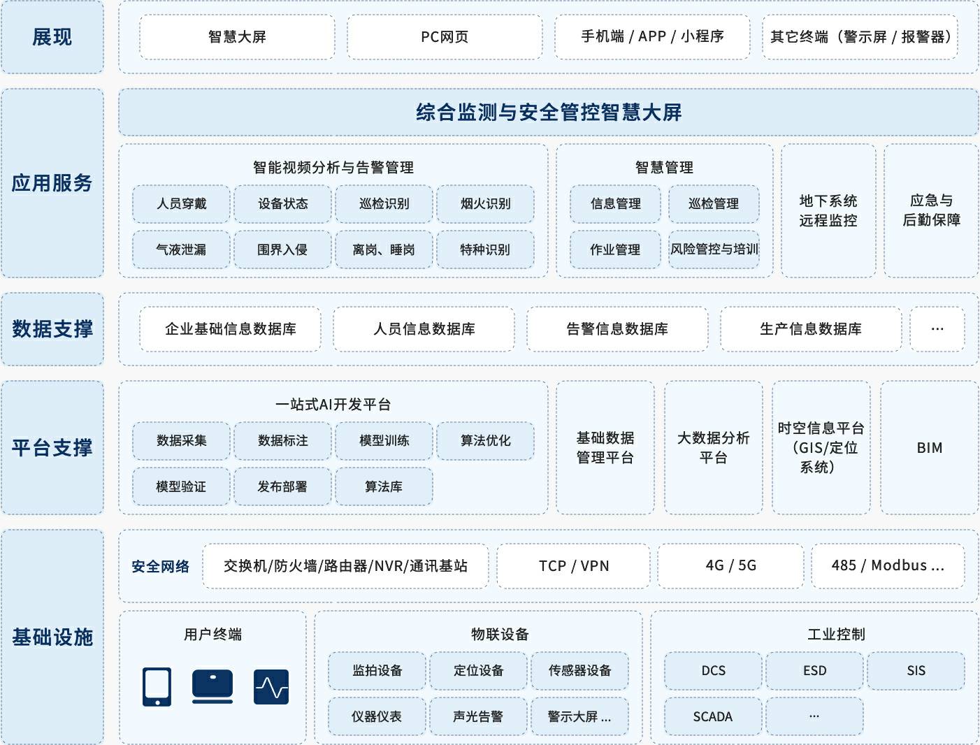 针对矿山安全生产的管理要求,紧抓需求痛点,开云官方网站·开云网站在线入口-开云(中国)创新提出“一基础、双支撑、多平台、N应用”的智慧矿山方案,实现不同阶段需求逐步实现未来智慧矿山。开云官方网站·开云网站在线入口-开云(中国)创新充分利用人工智能算法优势,从智能视频分析风险隐患切入,实现风险隐患全生命周期分析与管理,同时应用智慧化作业流程、智慧检维修提升作业生产效率,应急与后勤保障是重中之重,除了实现地下通风系统、定位系统、电力系统、通讯系统、排水系统以及环境监测系统的全天候监控之外,应急物资管理系统保障物资及时可用,人员设备定位系统保障下井人员位置的实时管控,充分实现应急后勤保障,开云官方网站·开云网站在线入口-开云(中国)创新智慧矿山方案永远将安全生产放在第一位。